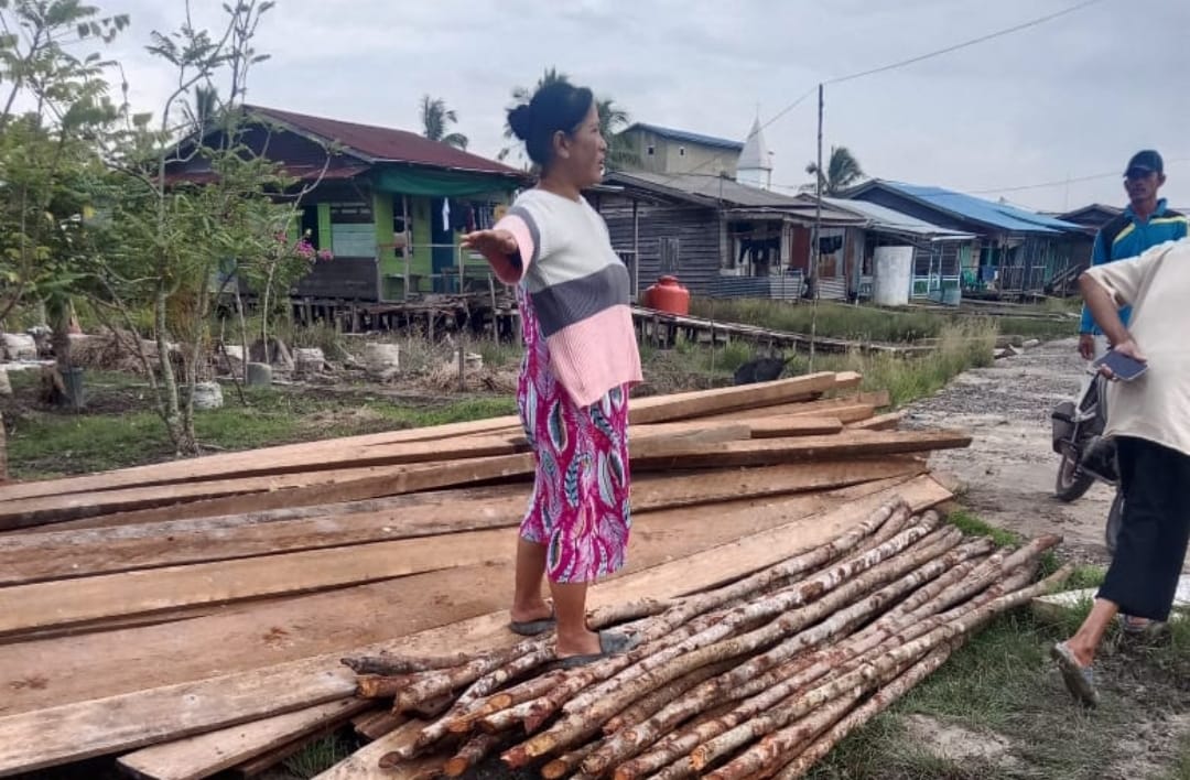 Waktu pengerjaan pembuatan kandang Kambing, tampak Bendahara Bumdes Pulau Harapan sedang mengawasi bahan material (Galeri Photo Desa Rohil Membangun)