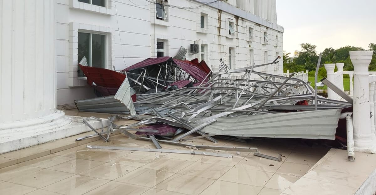Bagansiapiapi – Diduga berkualitas rendah dan tidak kokoh, Kanopi yang terbuat dari baja ringan dari lantai 9 kantor Bupati Rokan Hilir runtuh dan jatuh ke lantai dasar.