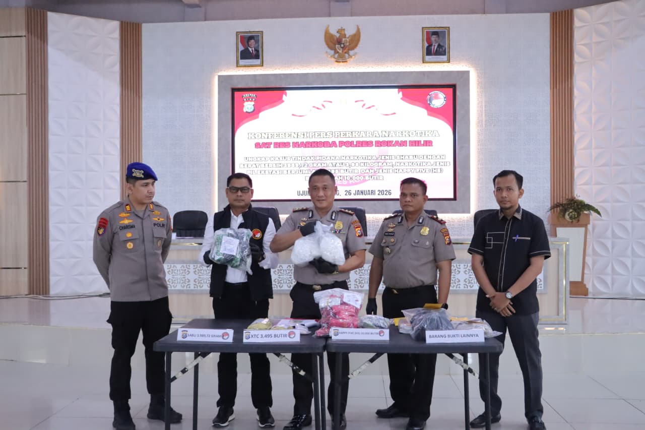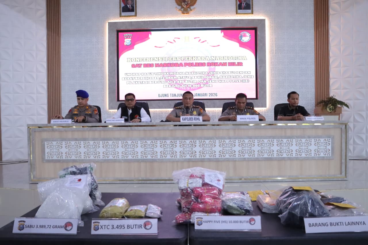 Dalam konferensi pers yang digelar pada Senin (26/1/2026) pukul 10.00 WIB di Tunggal Panaluan Polres Rohil, polisi memaparkan keberhasilan pengungkapan narkotika dengan barang bukti sabu seberat 3.989,72 gram (3,98 kilogram), ekstasi sebanyak 3.495 butir, serta happy five (HS) sebanyak 10.000 butir.